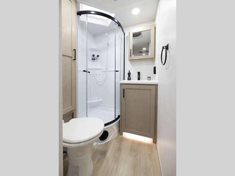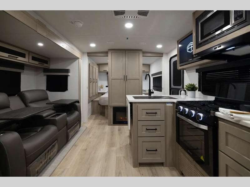 Each model is constructed with a fully laminated walkable roof, 6-sided full-aluminum frame, and a fiberglass front cap with Clear Coat for added protection. You will appreciate the slam baggage doors and 200W solar panel outside, plus there is a Climate Protection Package for better insulation. Inside, you'll love the solid surface countertops, roller shades, and soft close roller bearing drawers.